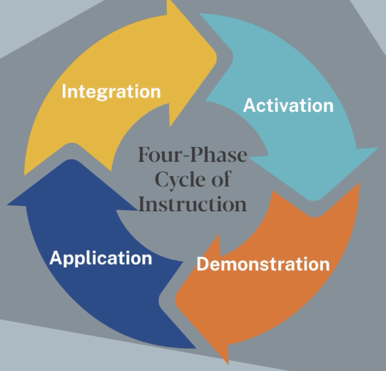 These principles aren’t exactly a model by themselves, but parts of a model that need to be applied in a framework when designing instruction. After reading a journal article on gamification utilizing Merrill’s principles of design, Esterhuizen, Drevin, Snyman, and Drevin (2022) explain “a principle in this context is a relationship that is always true regardless of the environment it is applied within.” Essentially, these principles can be applied independently or in combination with other frameworks. As a softball coach, I could see myself using all 5 principles when explaining new skills to players. While my example isn’t necessarily a technologically based design model, it adheres to Merrill’s key principles. If a coach were to use all the principles in one design (technically, the four-phase cycle), it could look as follows.
