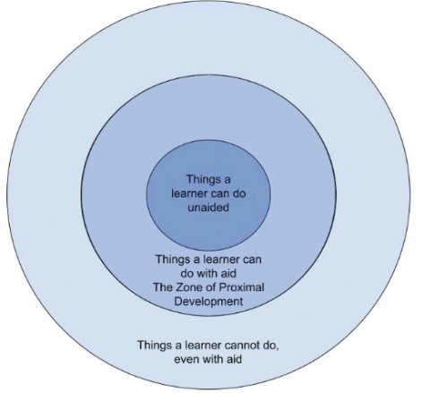 As seen in the example, the zone of proximal development is sandwiched between what the learner can and cannot do. If they can do the task without an aid, it is outside of their ZPD. If a learner cannot do a task, even with an aid, that task lies outside of their ZPD. Like goldilocks and the three bears, the task needs to be just right. If they keep doing tasks that they can already do, they won’t grow; if they do tasks that they can’t do, they won’t have the necessary prior knowledge to even attempt growth. For example, a student’s math knowledge compounds the more they learn new skills. If a student cannot do algebraic equations (simplify expressions / understand functions), they won’t be able to comprehend calculus because calculus is based on functions and simplifications.