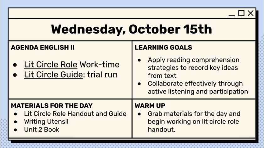 Repetition: The boxes repeat and so do the tasks for each box. There are bullet points between each expectation, guiding the reader through each box. The slides for everyday use this same format, making the formatting consistent for the student by day as well. Along with this, the tasks all relate to one another. It shows what, why, and how the students will be doing the task assigned, repeating the purpose of the day.