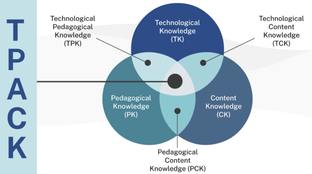 - TPACK (Technological Pedagogical Content Knowledge): Putting all the prior domains together. The final step integrates technology, pedagogy, and content into a cohesive approach to create meaningful and effective learning experiences (Mishra & Koehler, 2006 as cited in Prasetya & Irwanto, 2025).